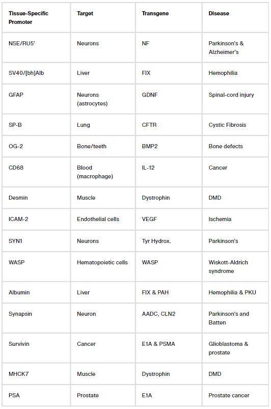 Figuring out ways to confine transgene expression to specific parts of the body is a more challenging problem. Here, again, there are two common solutions: Either package AAVs with microRNA binding sites that shut down transgene expression in cells with a matching microRNA (a decades-long area of study), or design tissue-specific promoters that only ‘switch on’ in certain cells.
